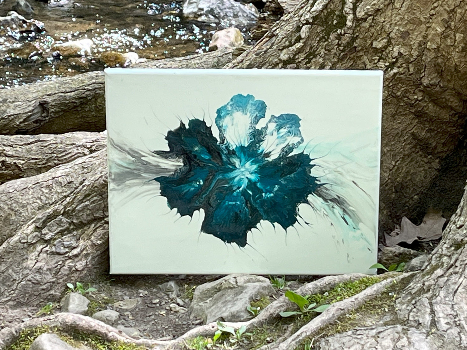 All of the paintings on the site have been created using the “pour” or “fluid” acrylic painting method. This involves the manipulation and movement of paint on canvas or other surfaces. Typically, and maybe surprisingly, no paint brushes are used in the process. Paint is layered and cells are formed through chemistry and physics. Results are often abstract in nature. I have been experimenting with this technique, “going with the flow”, and playing with the boundaries between what is representational and what is pure abstraction. The process can feel chaotic at times and outcomes are often surprising.