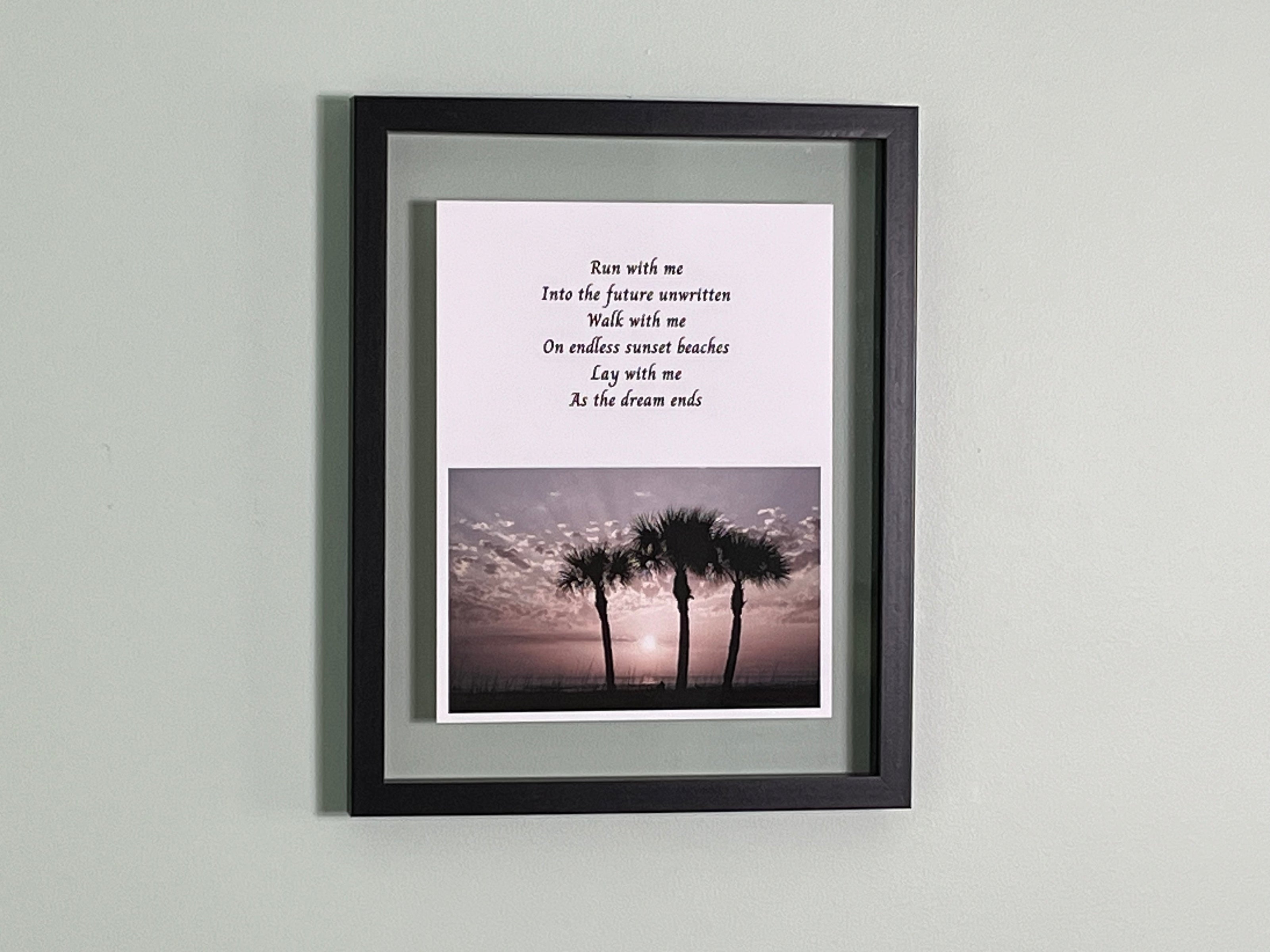 These are all occasion and no occasion cards. None of them scream “Happy Birthday” or “Happy Valentines”, but you are encouraged to add your own personal message on the blank insides. The images are photos I have taken over the years and the accompanying “poems” or “musing” are all my originals as well. They are meant to be used as greeting cards, of course, but they are also frameable art. The cards can be opened up and placed in floating frames I have sourced specifically for this purpose. These frames have 2 panes of glass which allows you to be able to view the back (or the inside message) whenever you wish. They are a card and a gift all-in-one.