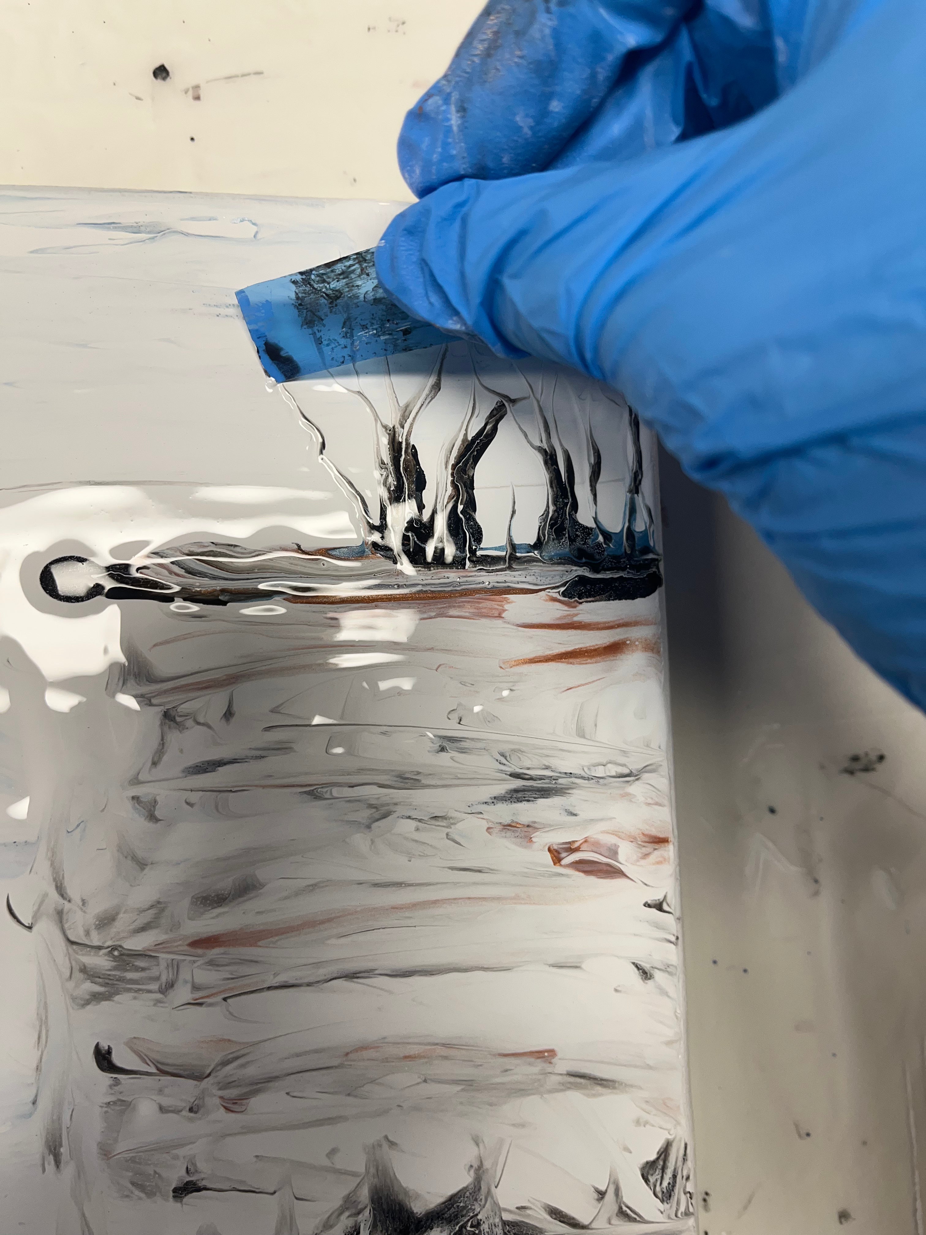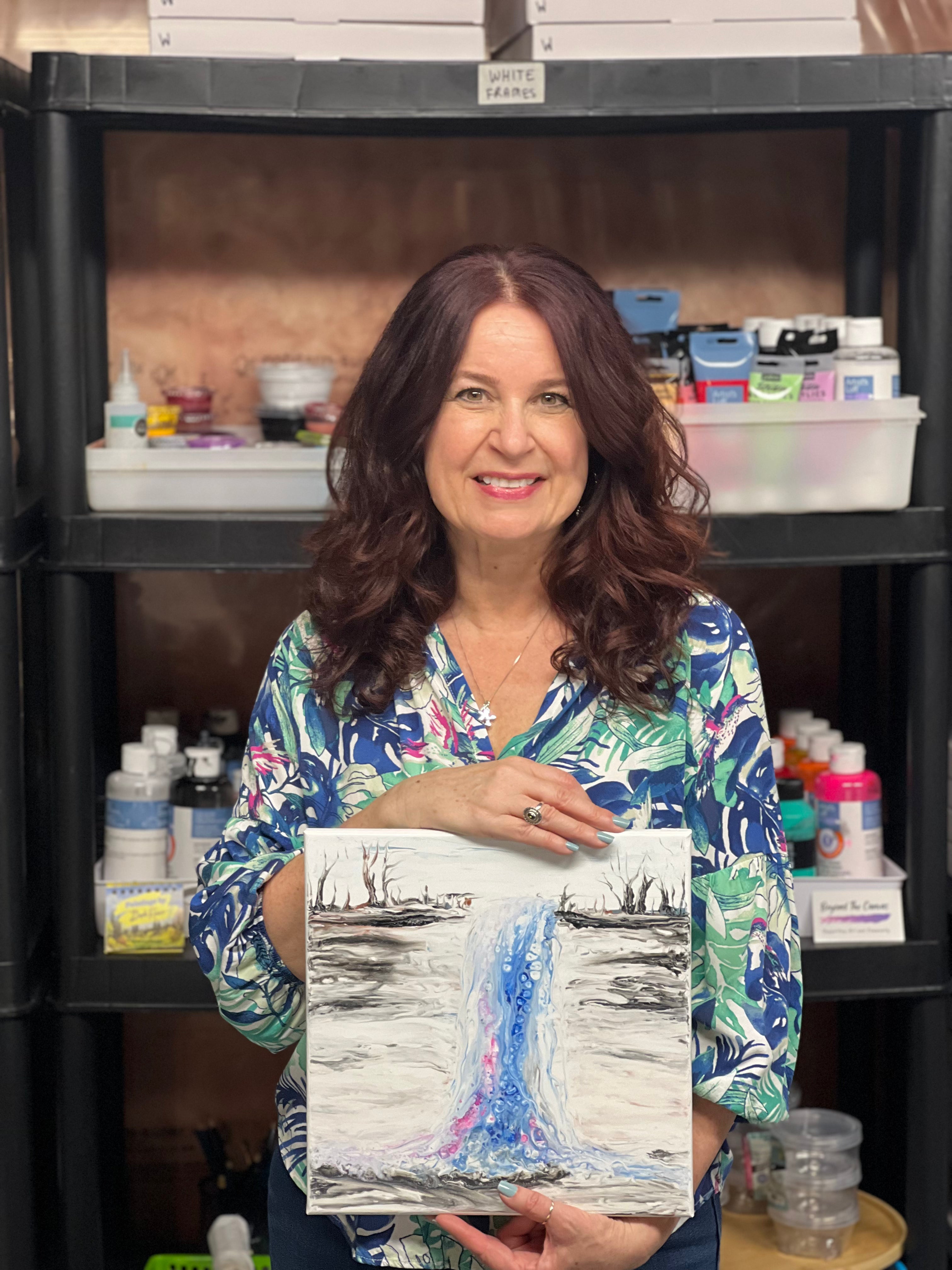 It has never been my nature to begin with the basics. I tend to do research and then dive right in. Pour painting doesn’t use brushes and lends itself to abstracts, but I wanted to coax something different from the canvas. In a lot of ways this technique is uncontrollable and unpredictable, definitely an exercise in experimentation and letting go–it is freeing. It was exactly what I needed when I needed it most.