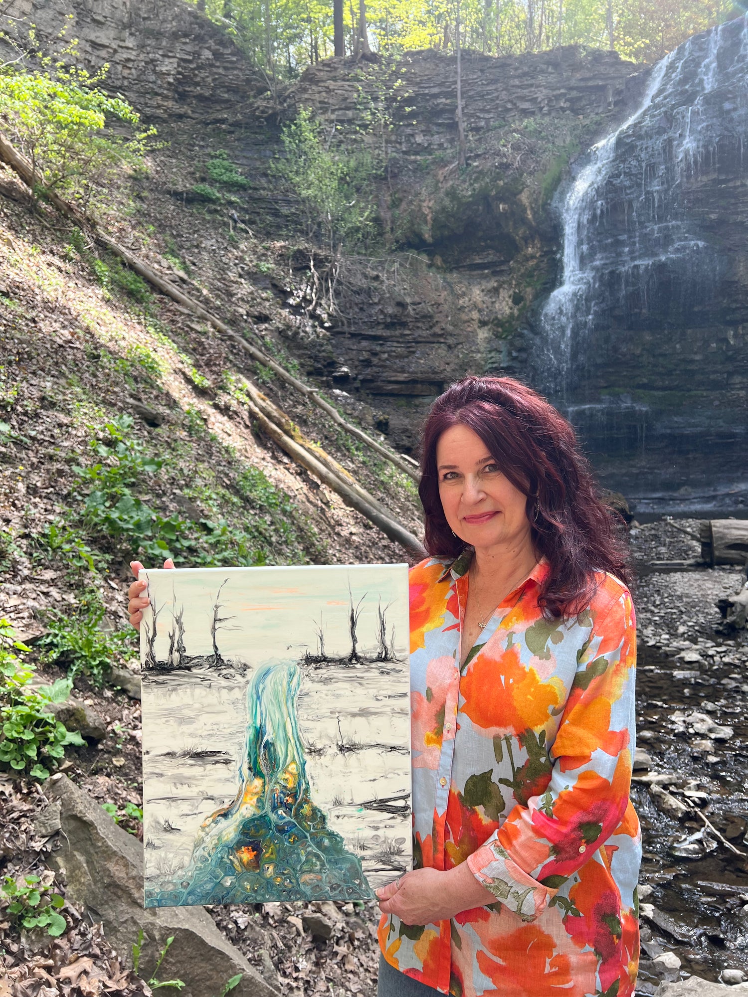 Everyone needs to find their happy place in life–a walk through the woods, a sunrise on an isolated lake, a cuddle with your favourite animal or person. One of my happy places has always been art. The problem was, I hadn’t been making time for it. When the pandemic hit, it brought art back to my life. Lockdowns found me surfing YouTube and discovering new techniques including “pour painting” or “flow acrylics”. After watching many (many!) videos, in early 2023 I decided to try it myself. This painting is the result. It is called “Group Of One”. It is an homage to Canada’s iconic Group Of Seven, of course, but also a reflection on an artist’s experience of creation which is mostly a solitary journey.