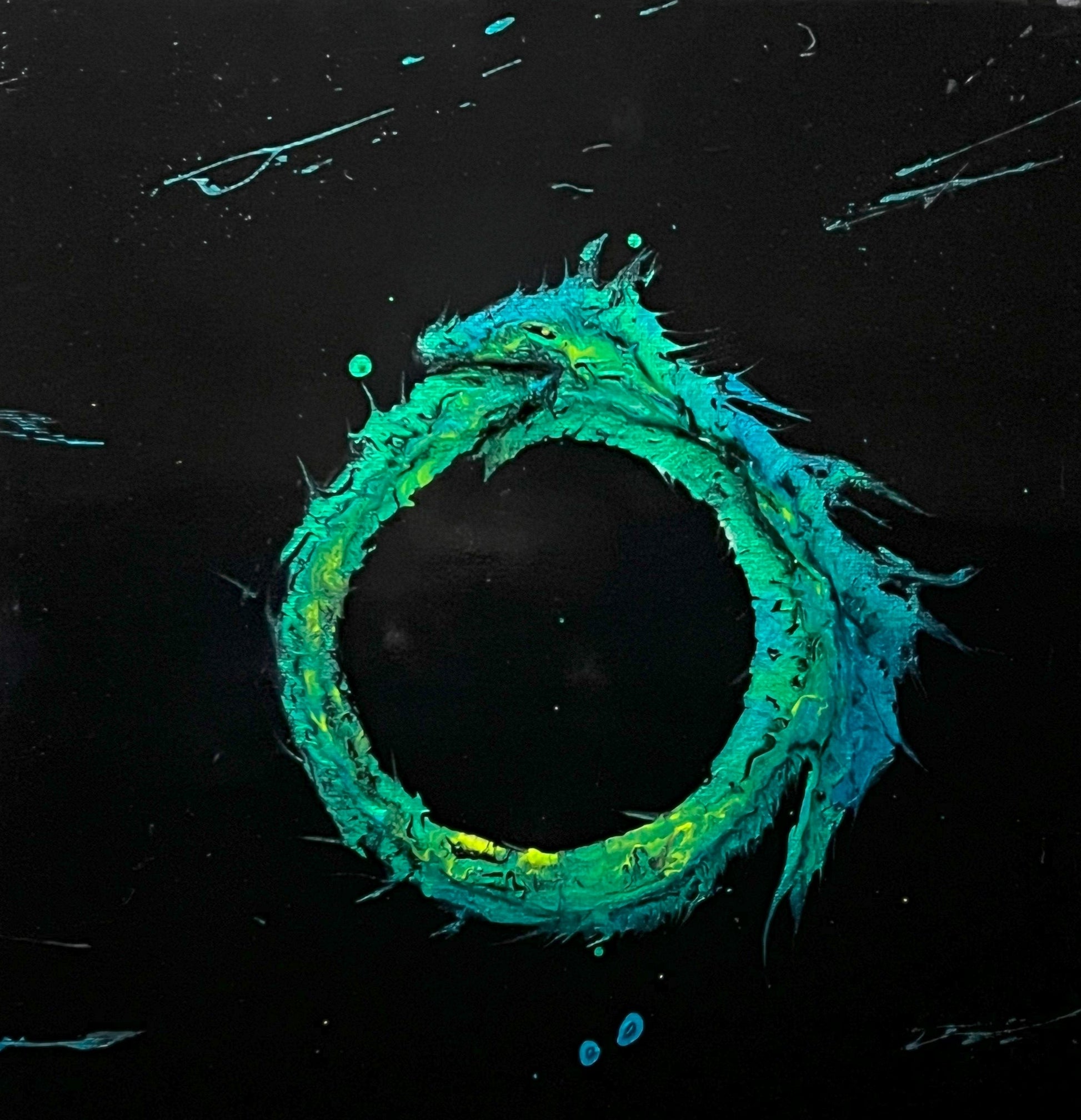 A precious metallic emerald ring, no beginning or end in sight. This is definitely a dragon--because if it were a snake then "The Darkness" would be a lot scarier.