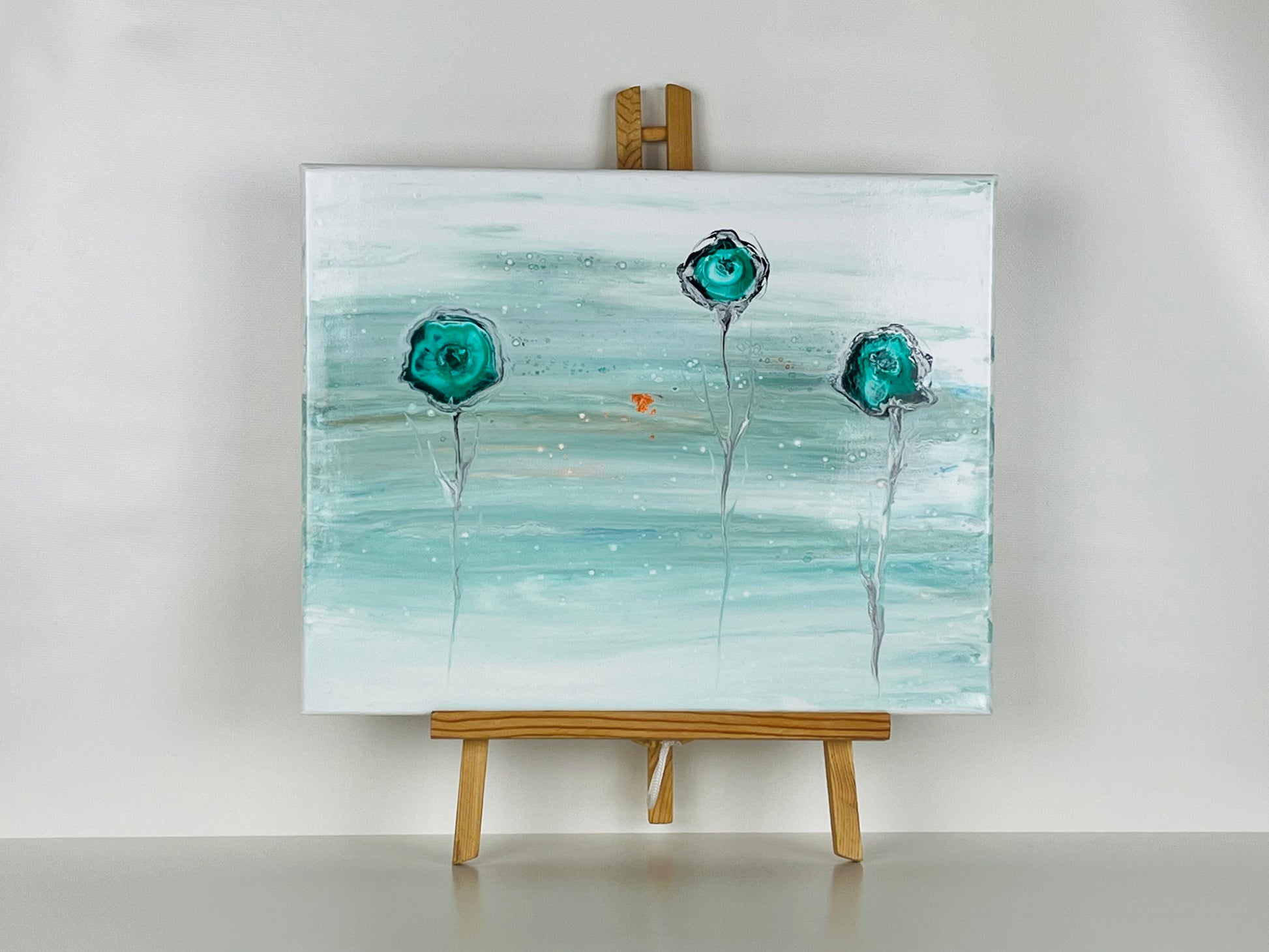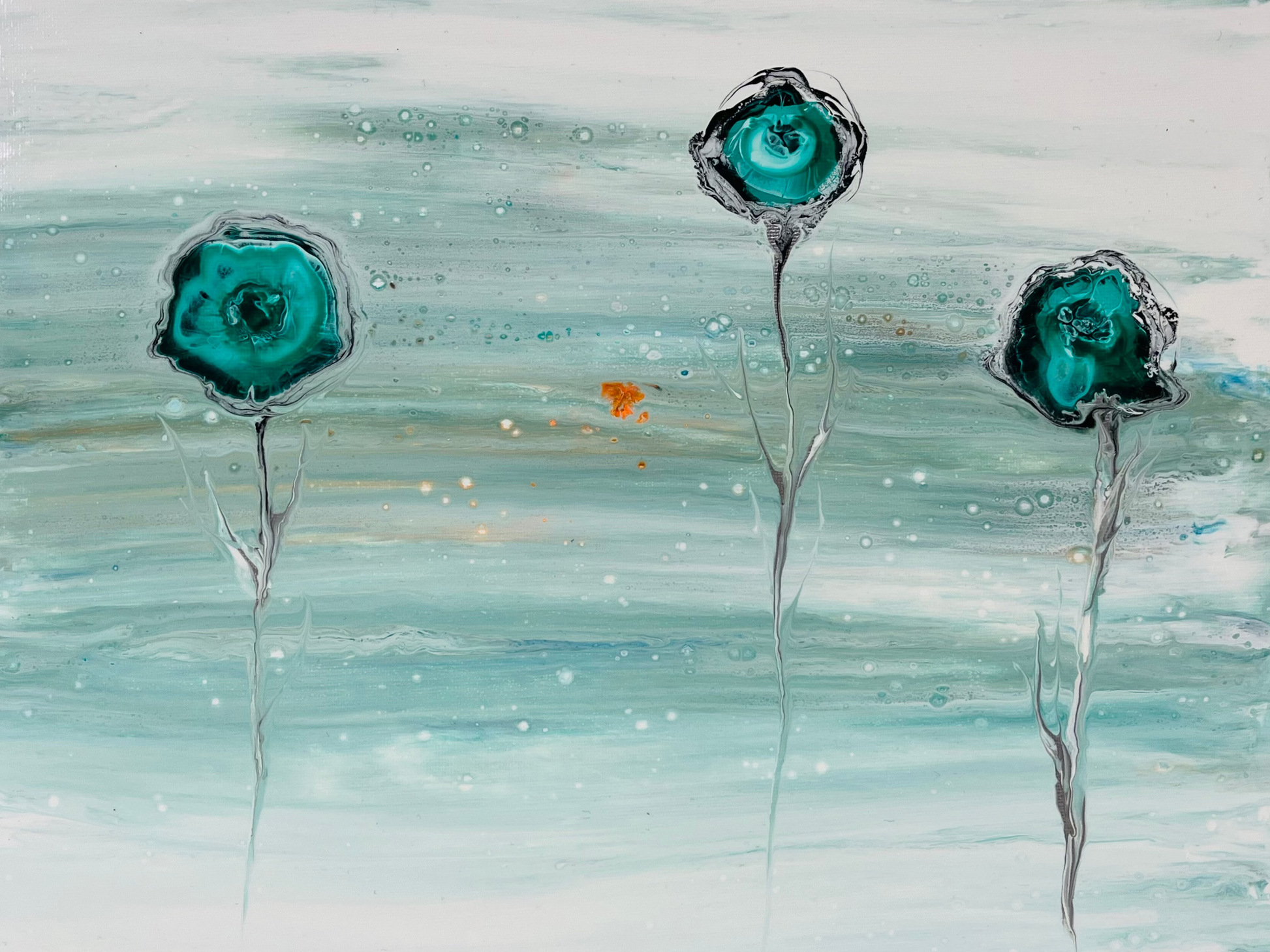These ghostly florals came about from a failed experiment resulting in my swiping the entire canvas. Often the paint does its own magical things, like the spectral silver stems and the flower heads that feel more like camera lenses.