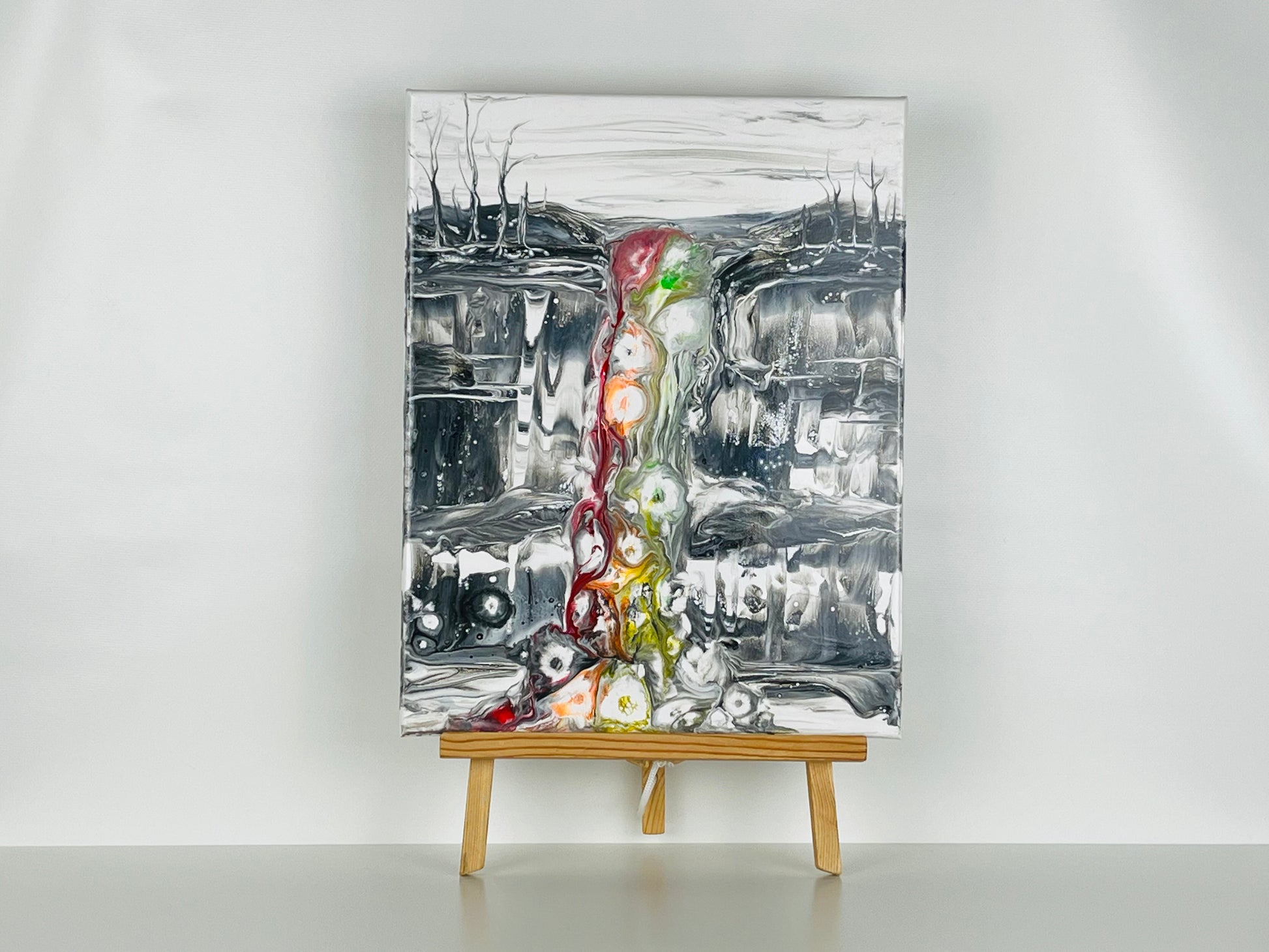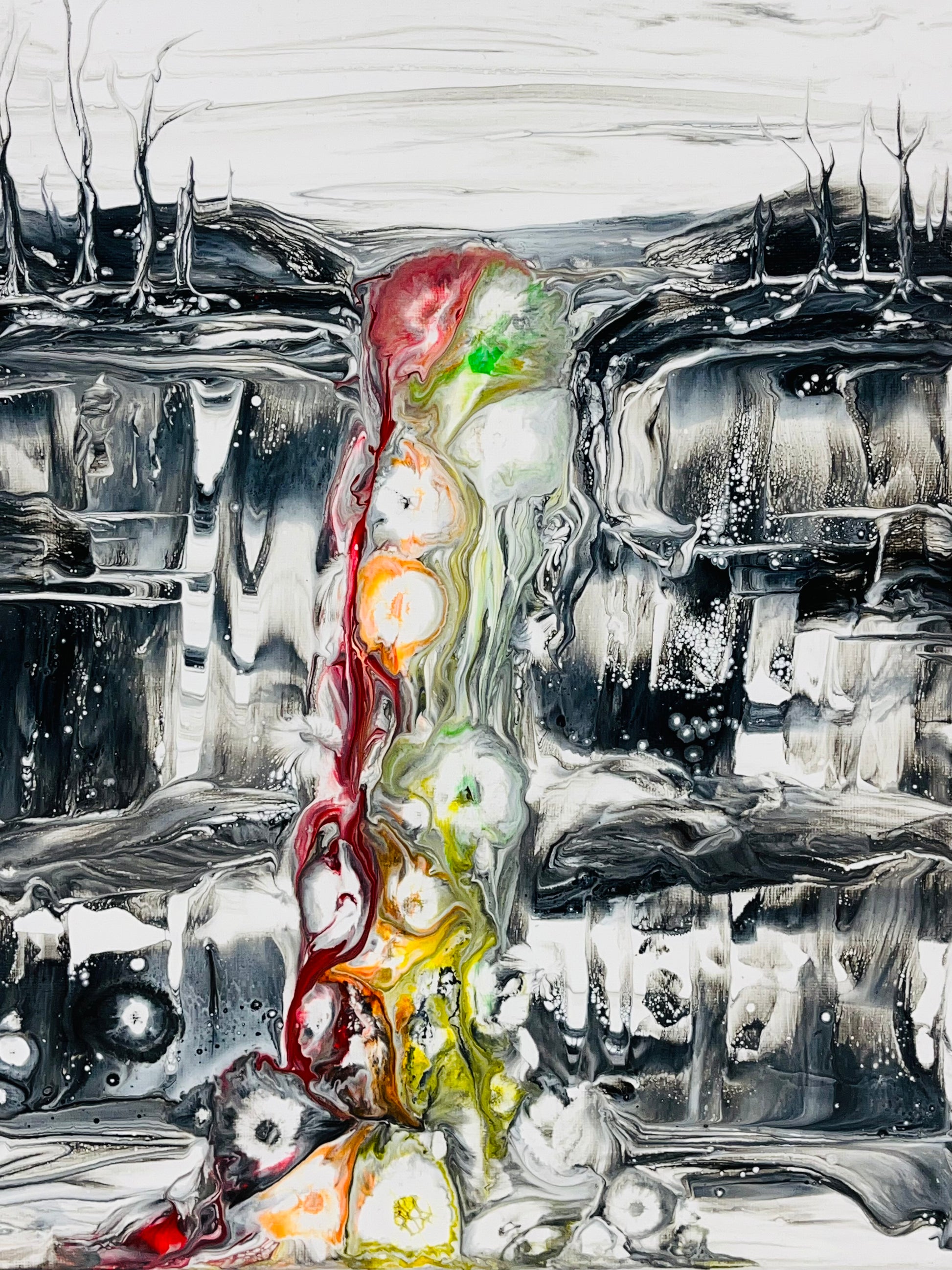 Is it a slice of rainbow or the colours of Autumn? This painting features big, juicy chameleon cells in the water and a very graphic tree line.